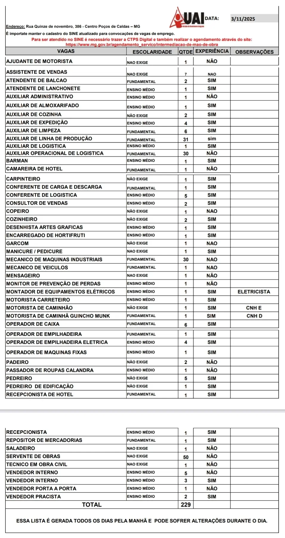 O Sistema Nacional de Empregos (Sine) tem 229 vagas cadastradas para Poços de Caldas nesta segunda-feira (3). Para se inscrever, em qualquer uma das oportunidades, o candidato deve fazer o agendamento online (clicando aqui).