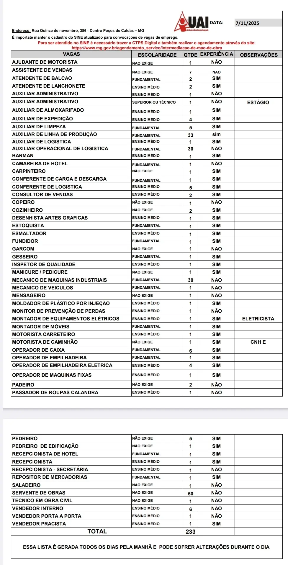 O Sistema Nacional de Empregos (Sine) tem diversas vagas cadastradas para Poços de Caldas nesta sexta-feira (7). Para se inscrever, em qualquer uma das oportunidades, o candidato deve fazer o agendamento online (clicando aqui).
