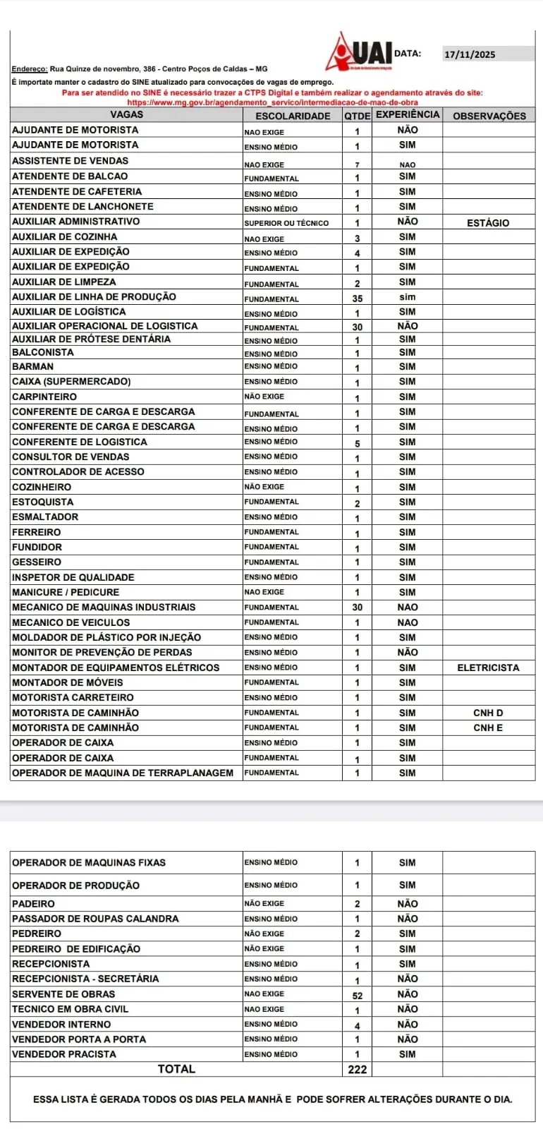 O Sistema Nacional de Empregos (Sine) tem 222 vagas cadastradas para Poços de Caldas nesta segunda-feira (17). Para se inscrever, em qualquer uma das oportunidades, o candidato deve fazer o agendamento online (clicando aqui).