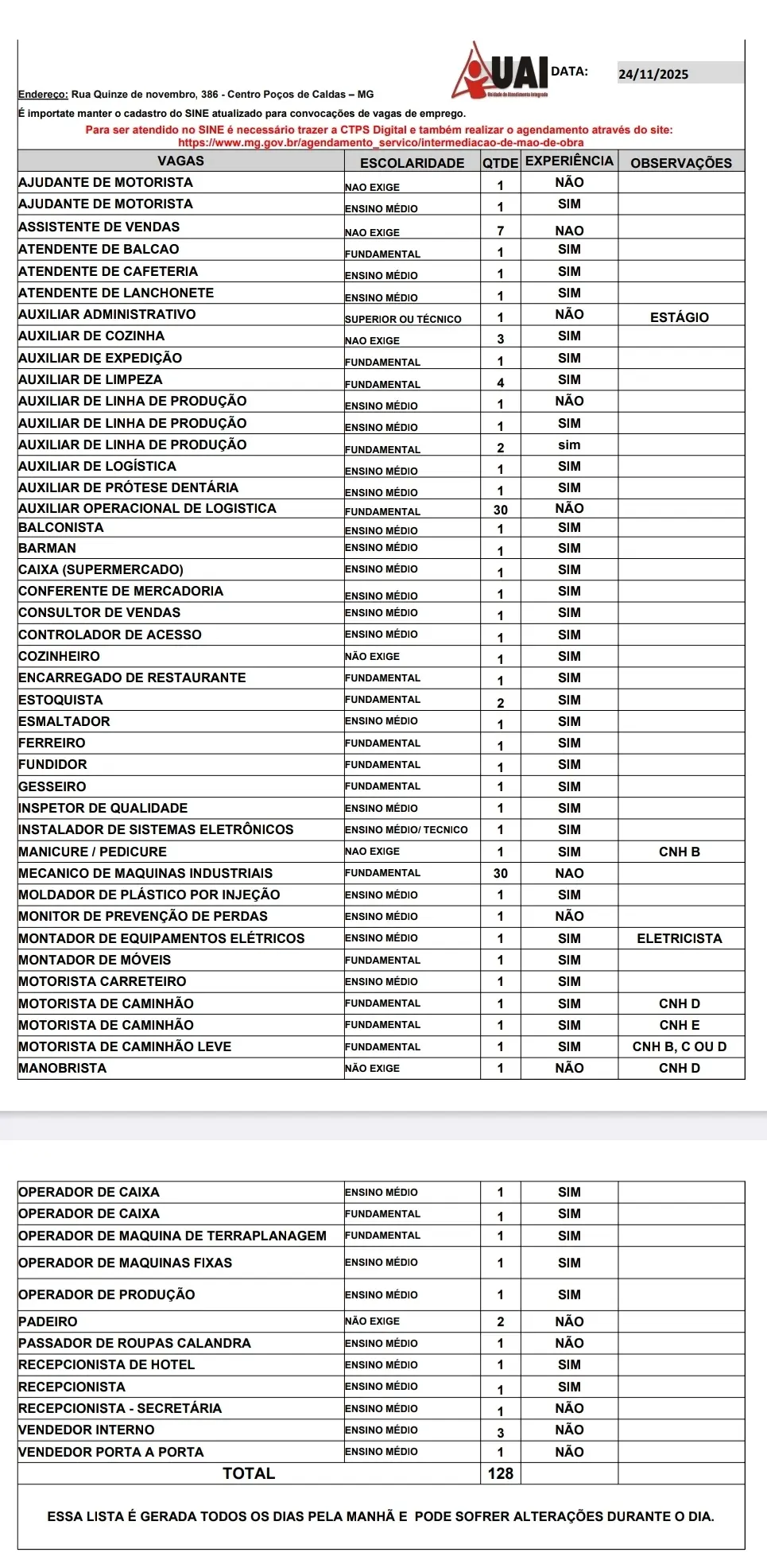 O Sistema Nacional de Empregos (Sine) tem 128 vagas cadastradas para Poços de Caldas nesta segunda-feira (24). Para se inscrever, em qualquer uma das oportunidades, o candidato deve fazer o agendamento online (clicando aqui).
