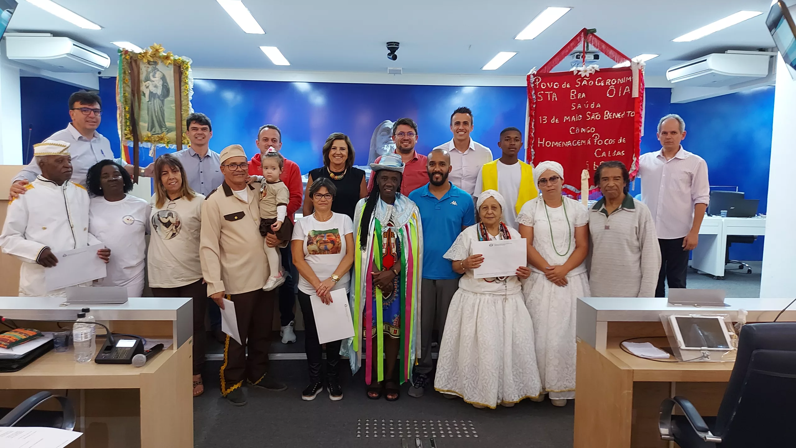 A homenagem foi feita pelo vereador Flávio Togni de Lima e Silva (PSDB), através de requerimento aprovado em plenário e assinado também pelos vereadores Luzia Martins (PDT) e Douglas Dofu (União Brasil). “Muito feliz em ver esta Casa Legislativa com presenças tão ilustres, que se dedicam à representação da nossa fé, nossa história e nossa cultura. Tradição centenária na cidade de Poços de Caldas, os Ternos de Congos são a expressão máxima da Festa de São Benedito, realizada ao menos desde 1904, data do primeiro registro preservado que garante a sua execução, ainda na então Freguesia da Nossa Senhora da Saúde das Águas de Caldas. Este é um rico patrimônio nosso. Depois de três anos sem esta tradicional Festa, este ano a teremos, outro motivo para comemorarmos”, disse Flavinho.