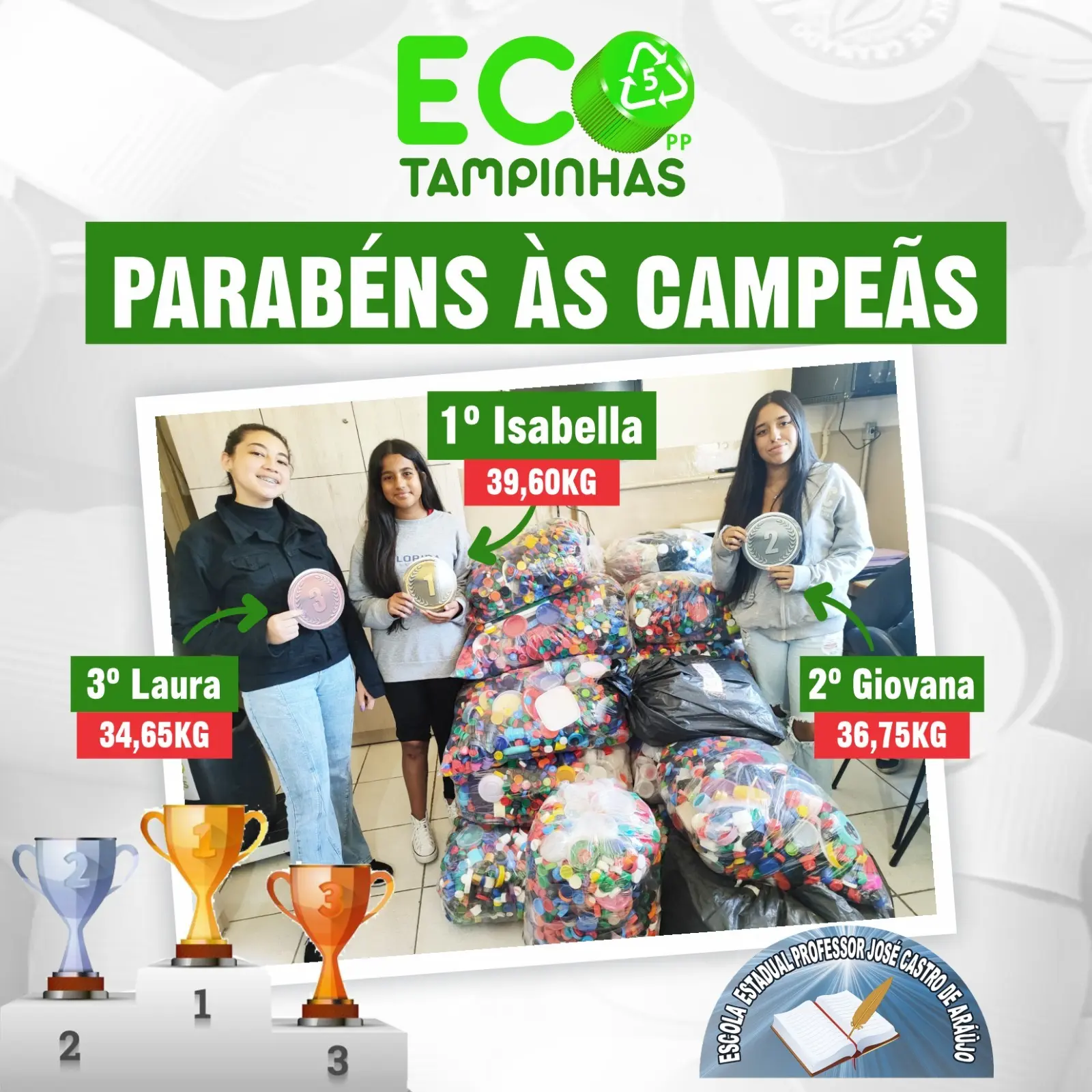 Nesta edição, três estudantes se destacaram pelo volume arrecadado. O primeiro lugar ficou com Isabella, do 6º ano, que coletou 39,60 kg de tampinhas. Em segundo lugar, Giovana, do 9º ano, arrecadou 36,75 kg. Já o terceiro lugar foi conquistado por Laura, do 8º ano, com 34,65 kg.