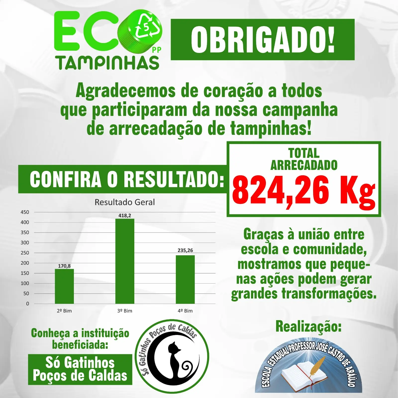 A Escola Estadual Professor José Castro de Araújo divulgou esta semana o balanço final da campanha Eco Tampinhas. A iniciativa mobilizou estudantes e comunidade escolar na arrecadação de tampinhas plásticas com finalidade socioambiental. Ao todo, 824,26 quilos de material foram coletados ao longo do ano.